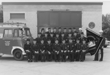 Gruppenbild der aktiven Wehr Anfang der Achtziger Jahre vor dem Feuerwehrgerätehaus.