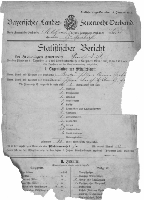 1913 wurde im Statistischen Bericht an den Bayerischen Landes-Feuerwehr-Verband detailliert über die Organisation und Mitgliedschaft, Inventar wie Steig- und Löschgeräte, Schlauchmaterial, Rettungs- und sonstigen Geräte, Uniformierung und Mannschaftsausrüstung sowie Dienstbücher berichtet. Die Mitgliedschaft bestand aus 36 aktiven Wehrmännern, wobei 12 von diesen der damals noch existierenden Pflichtfeuerwehr angehörten.