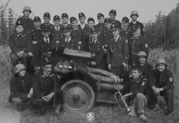 Die aktive Wehr im Jahre 1953 mit Feuerwehrspritze (wurde oft auch per Hand gezogen)